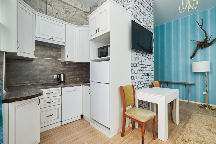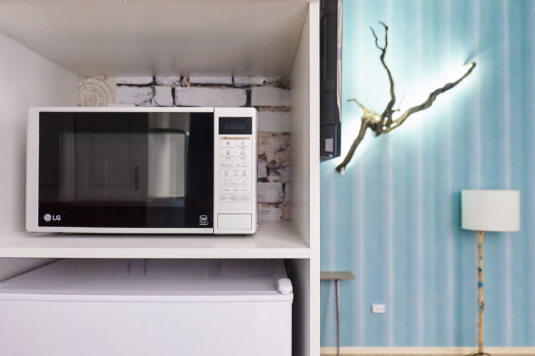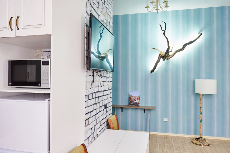 Сплит система, SMART телевизор, скоростной WiFi, двуспальная кровать, две раскладные кровати ИКЕА, полноценная кухня. Холодильник, микроволновая печь, духовка, кофеварка, посудомоечная машина, плита, посуда. Санузел с новой сантехникой, душевой кабиной. Имеется фен, проточный фильтр для воды. В этом апартаменте может разместиться семья из четырех человек или три самостоятельных гостя.