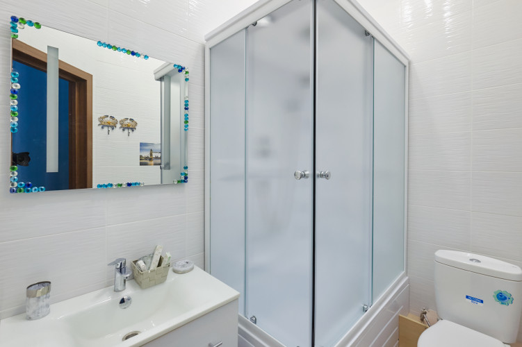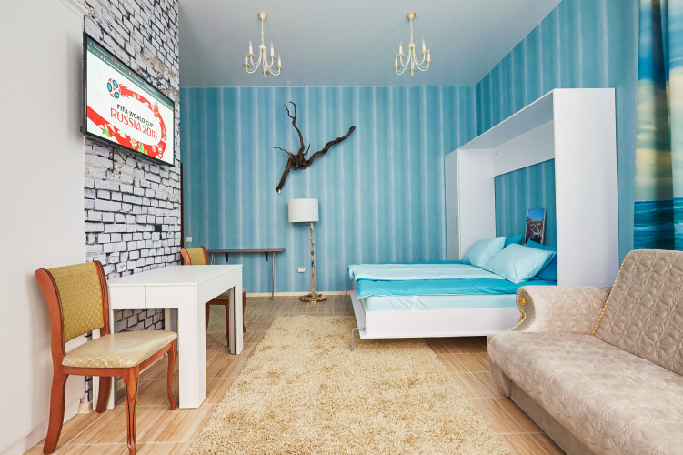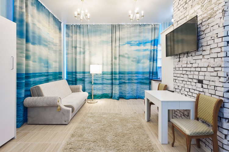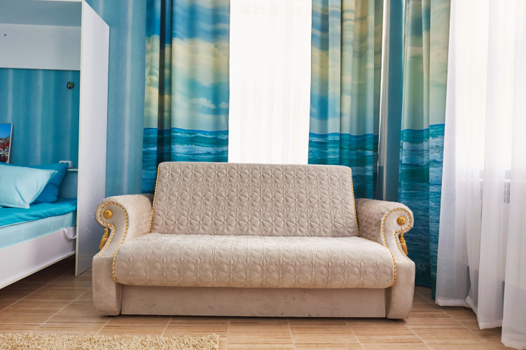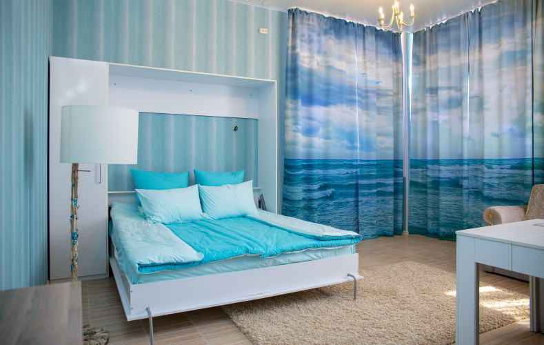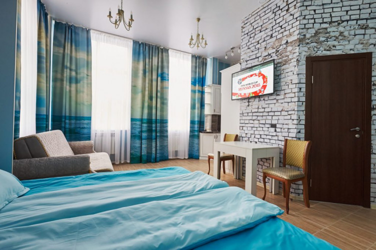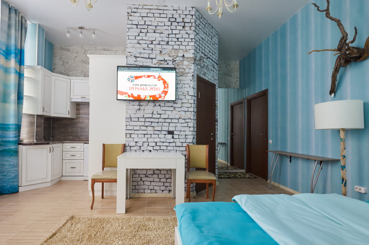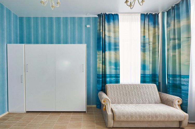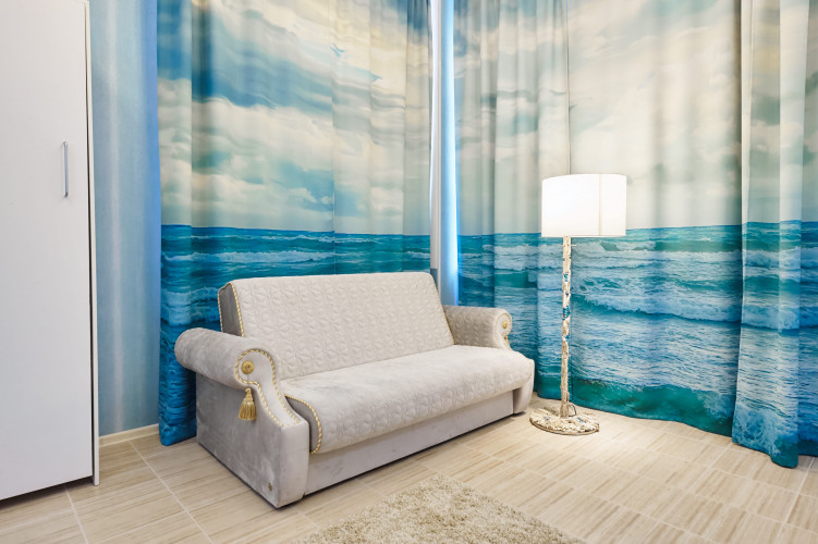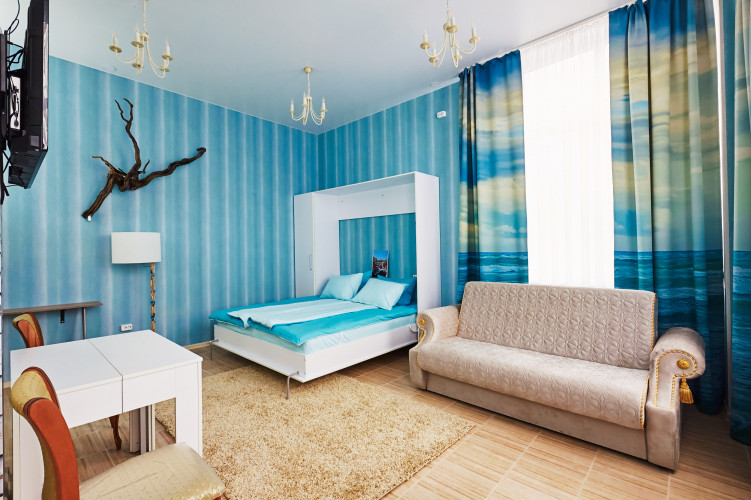 Апартамент "Морской" входит в блок апартаментов на 1 этаже с отдельным входом и является хитом продаж в нашей гостинице. Светлый с большими окнами, выполненный в морском стиле, он привлекает пары, семьи, командированных. Апартамент имеет три спальных места: двуспальная кровать 180см спальное место и две раскладных односпальных кровати, с ортопедическими матрасами.