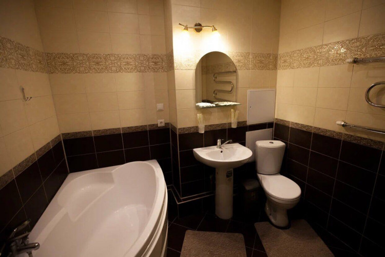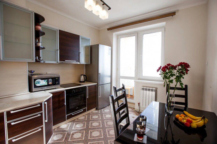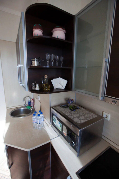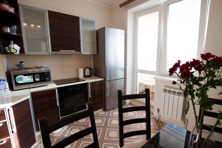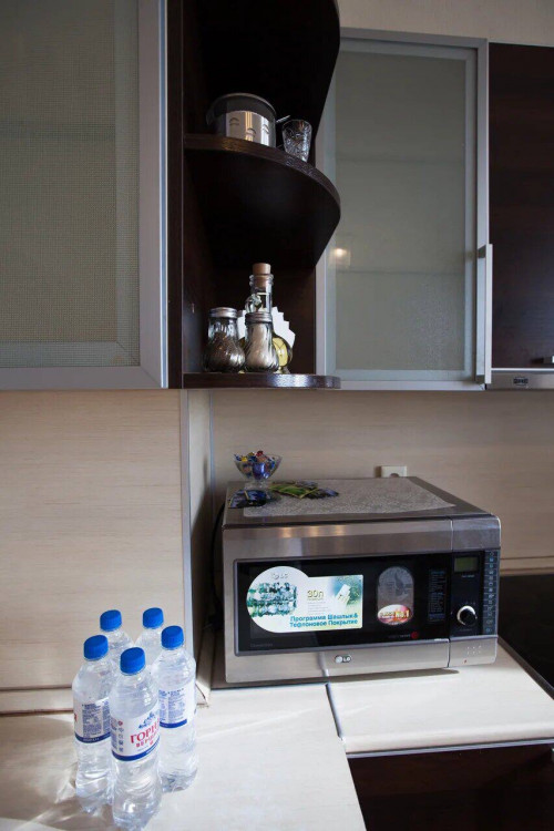 На кухне вы найдёте все необходимое: холодильник, чайник, микроволновая печь, электроплита и духовка, вся необходимая посуда, соль, перец, сахар, подсолнечное масло, чай, кофе.